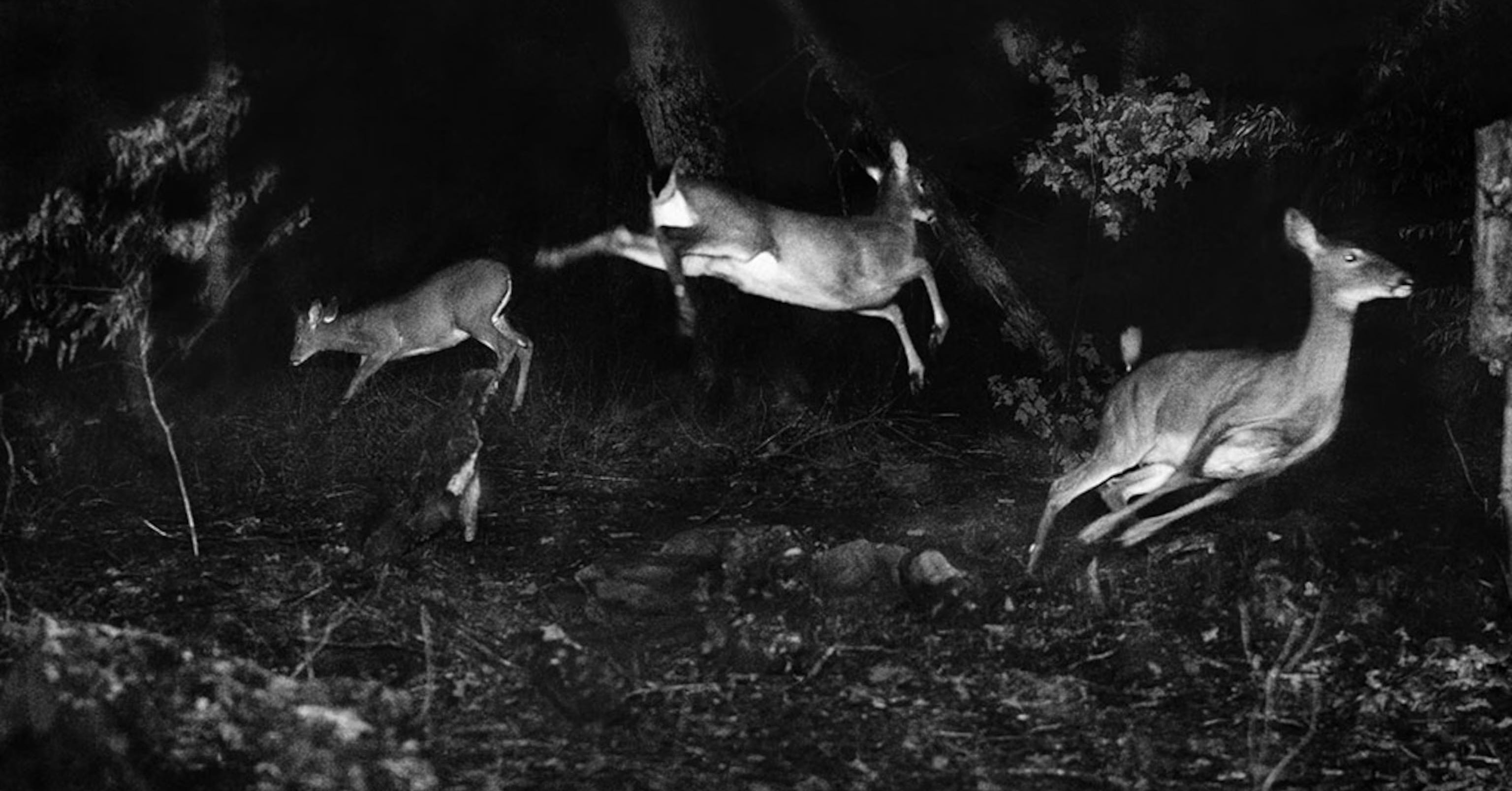 One of his earliest nighttime flash photos, taken in Michigan, shows three white-tailed deer running away: