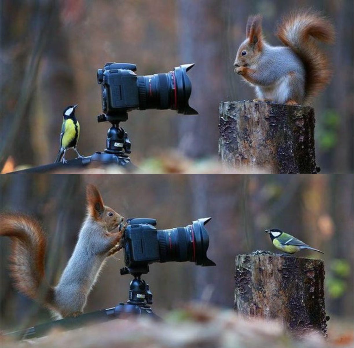 Russian nature photographer Vadim Trunov is no stranger to getting up close with wildlife, but this time he captured a truly enchanting moment. In a forest in Russia’s Voronezh region, a red squirrel jumped behind his tripod, resting both paws on the camera as if ready to snap the perfect shot of a passing blue tit. Then, in a whimsical twist, the two animals switched places, creating a playful scene straight out of a storybook: