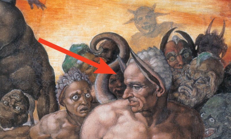 A vision of cosmic judgment — saints and sinners whirling through space, the blessed rising and the damned dragged down — painted with a ferocity that shocked even those who had commissioned it. The papal master of ceremonies denounced it as a disgraceful thing, not fit for the chapel of a Pope but for a tavern. Michelangelo’s response was to paint his face on the figure of Minos in Hell, complete with donkey ears — a symbol, in Renaissance iconography, of irredeemable stupidity.