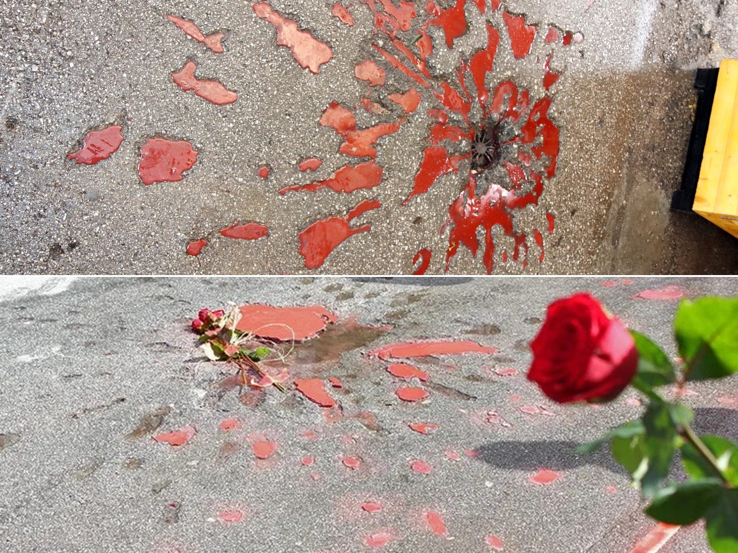 After the war ended, residents did something that no authority had planned or commissioned. They found the mortar craters in the pavement and filled them with blood-red resin.