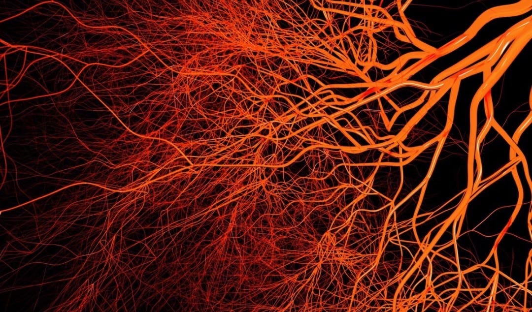 Your body contains about 60,000 miles of blood vessels — enough to circle the earth twice over — all folded inside a body you can wrap your arms around. From the aorta, wide as a garden hose, they branch and narrow and divide, all the way down to capillaries so fine that red blood cells must pass through them in single file.