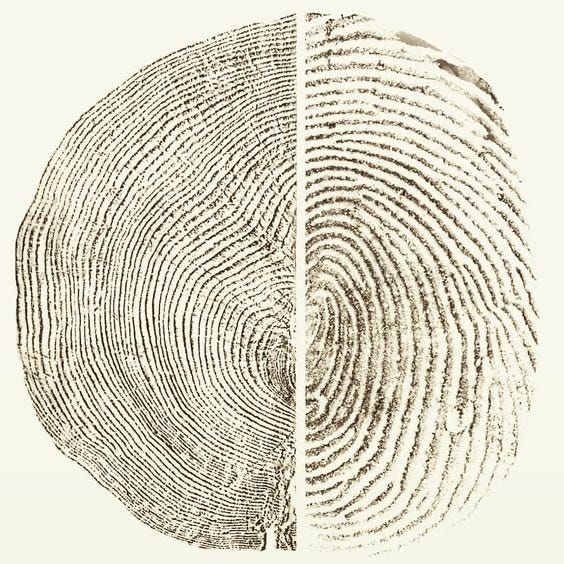 Both are records of a life. A tree ring measures time in seasons, written from the outside in. A fingerprint captured a single unrepeatable moment of becoming — the precise swirl of fluid around a fingertip, one afternoon, before you had even taken your first breath.