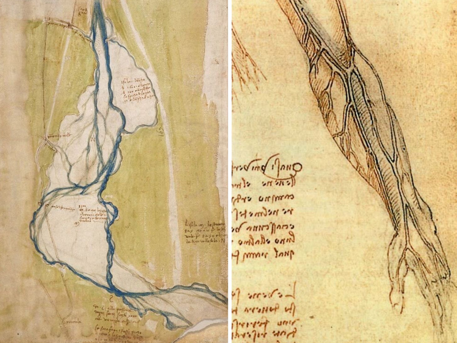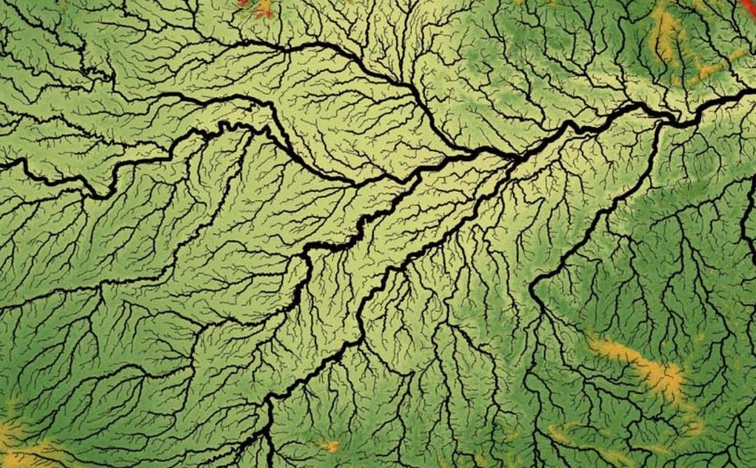 Every river on earth works the same way. Da Vinci watched rivers and drew veins and saw the same thing moving through both. He was right. The body is a landscape. The landscape is a body.
