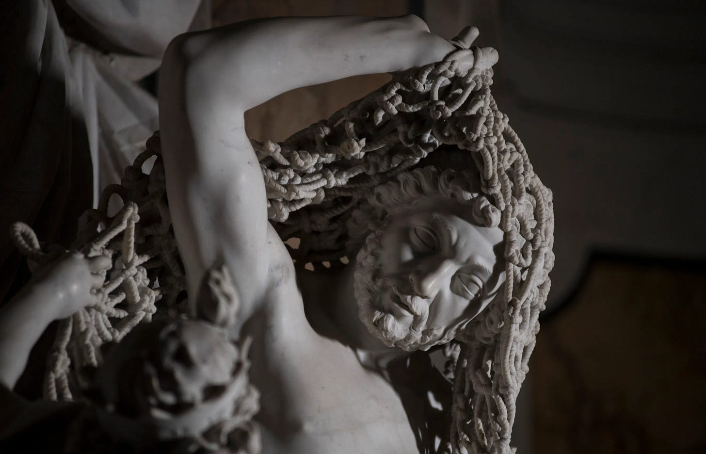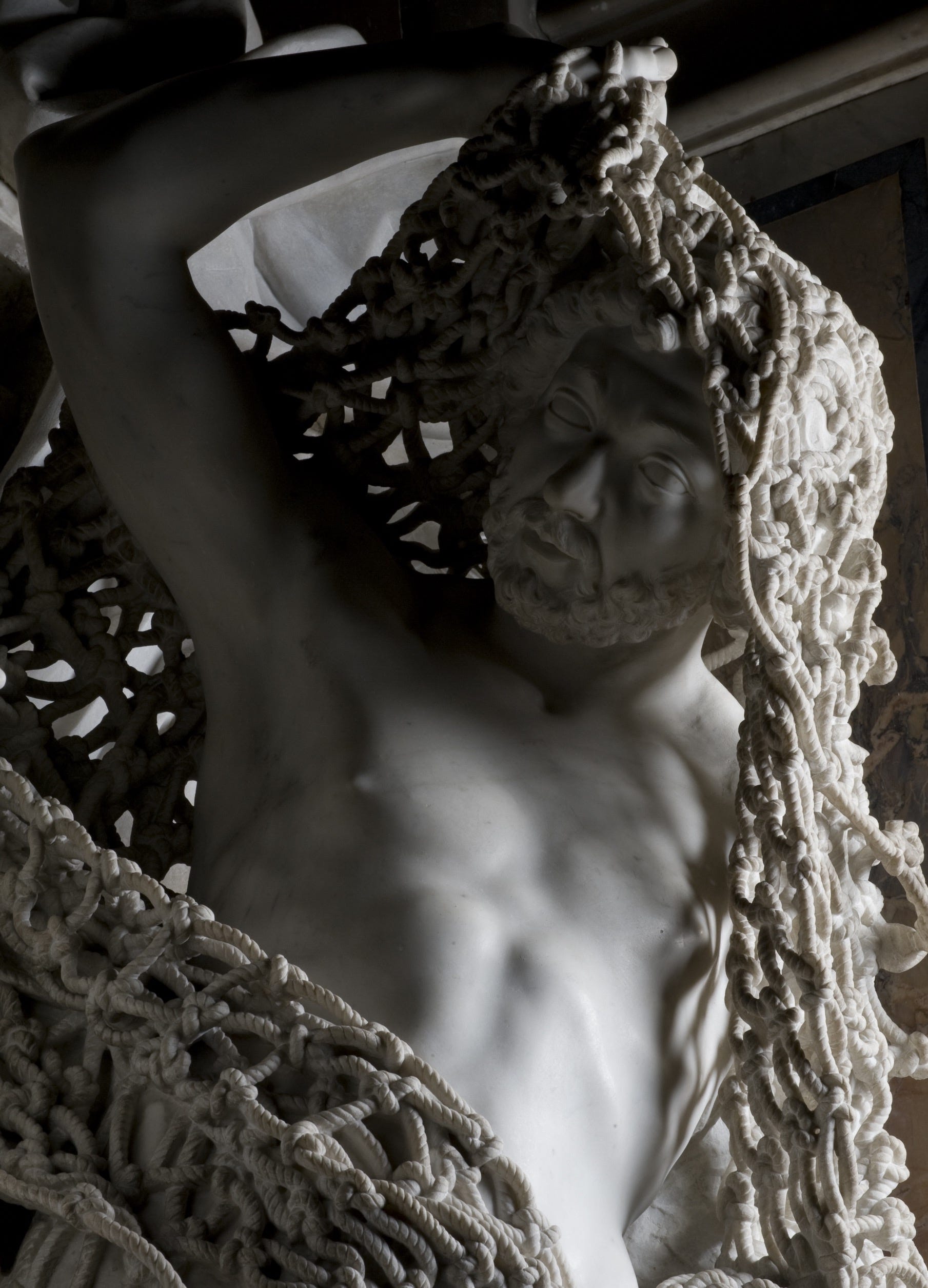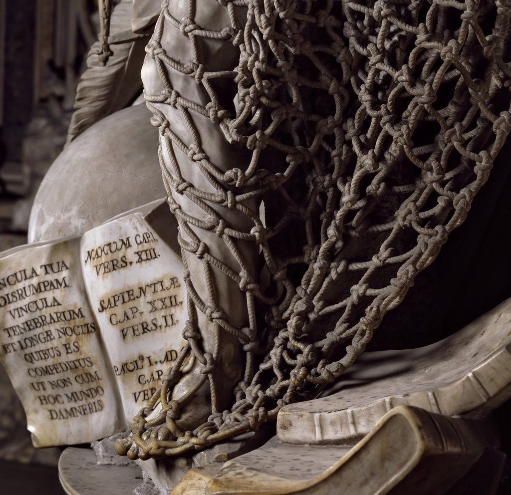 It hangs across the entire sculpture with only a handful of contact points holding it to the figure beneath — draped, knotted, catching light the way real rope catches light — carved from the same solid block as everything else. So delicate, so precisely cut, that no apprentice in Queirolo’s workshop would go near it for fear that a single wrong movement would bring the whole thing crumbling down. The historian Giangiuseppe Origlia, writing at the time, called it “the ultimate bold test that marble sculpture can dare to attempt.”
