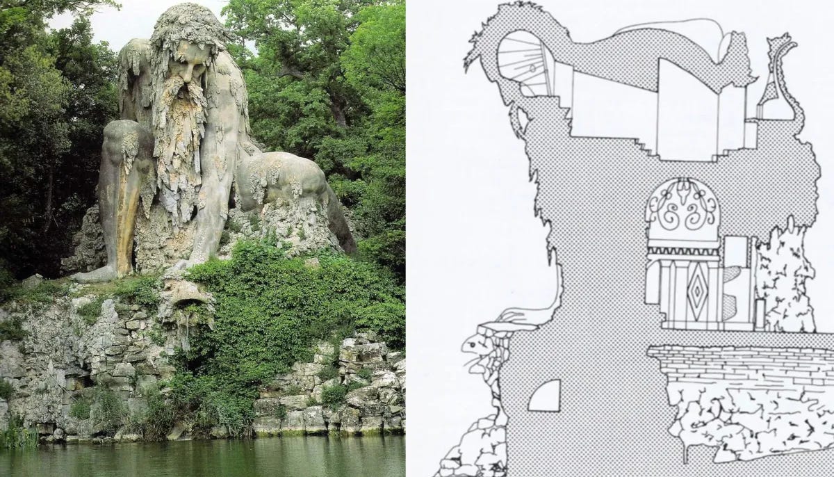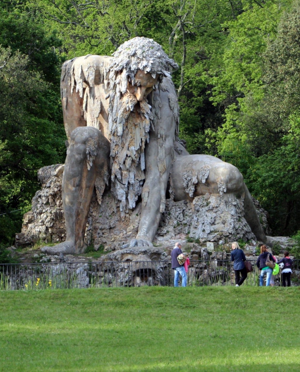 The Apennine Colossus rises eleven metres from the grounds of the Villa Demidoff in Tuscany, built in the late 1580s by the Flemish sculptor Giambologna as a personification of the Apennine Mountains themselves. Inspired, it is believed, by Ovid’s description of a mountain-like Atlas in the Metamorphoses, the giant emerges from the landscape as if he has always been there — his body merging with rock and moss and earth, stalactites forming his beard, his hair dissolving into stone. With one hand he crushes the head of a sea monster, from whose open mouth water pours into the pond below.