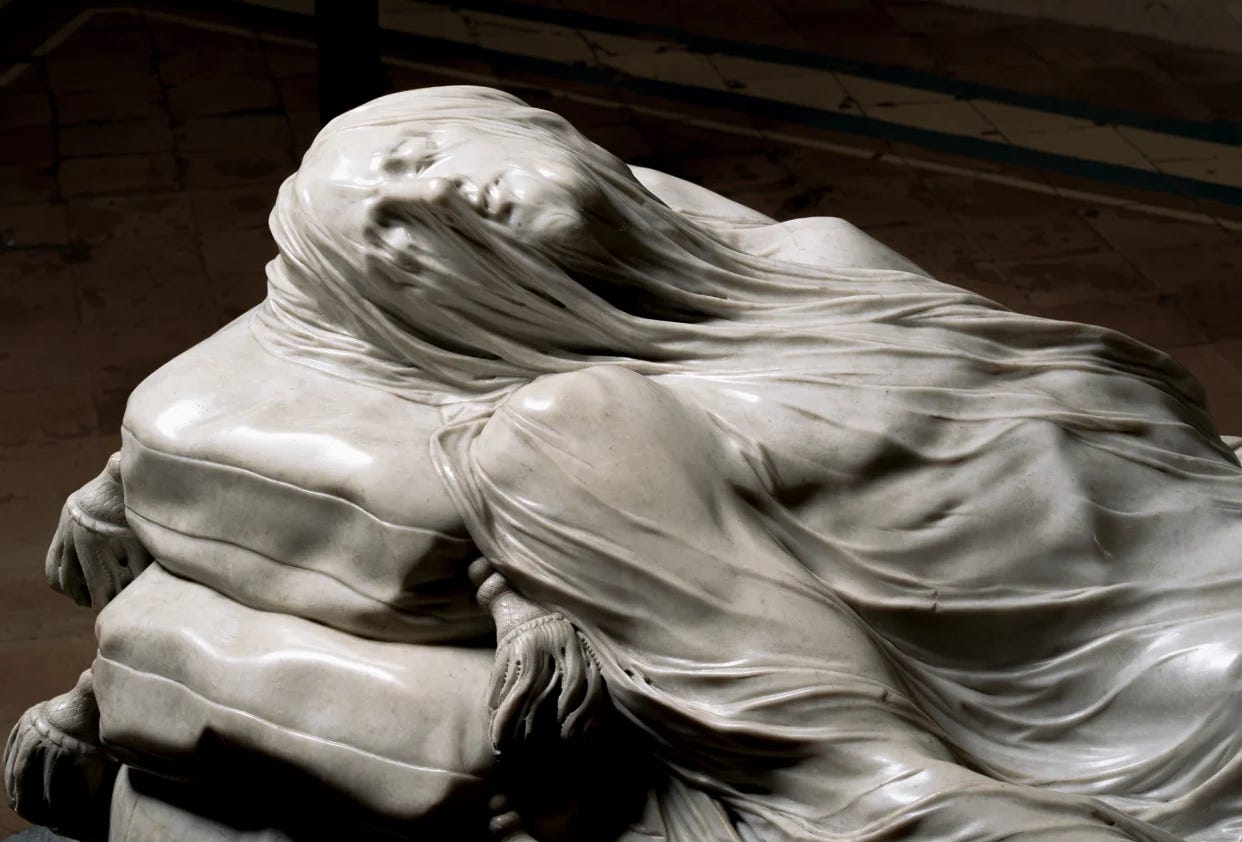 What he produced was so astonishing that his contemporaries refused to believe it was possible. The veil that drapes over the body of Christ is rendered with such impossible precision — every fold, every shadow, every place where fabric clings to skin — that a legend formed almost immediately: that the commissioner, the nobleman and alchemist Raimondo di Sangro, had laid a real cloth over the statue and transformed it into marble through a secret chemical process.