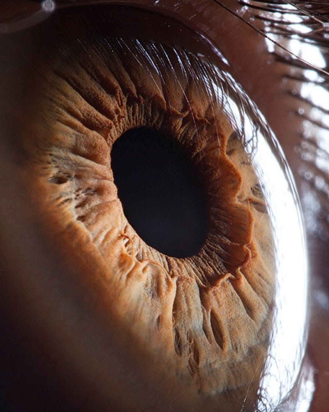 This stunning photograph by Suren Manvelyan opens a window into the depth of the human eye. Beyond the cornea lies the iris, the colored part of the eye that regulates the size of the pupil.