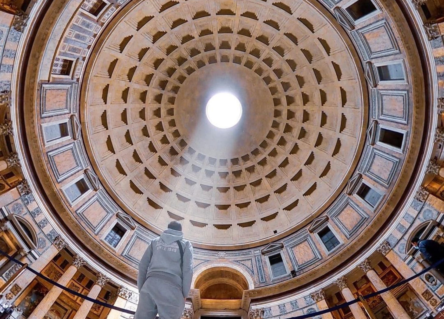Every year on April 21st — the founding date of Rome — at exactly noon, the beam of light that enters through the oculus falls directly onto the entrance of the building, illuminating anyone who passes through it. Researchers have confirmed this alignment was deliberate: on Rome’s birthday, the emperor entered the Pantheon bathed in a column of sunlight descending from the heavens.